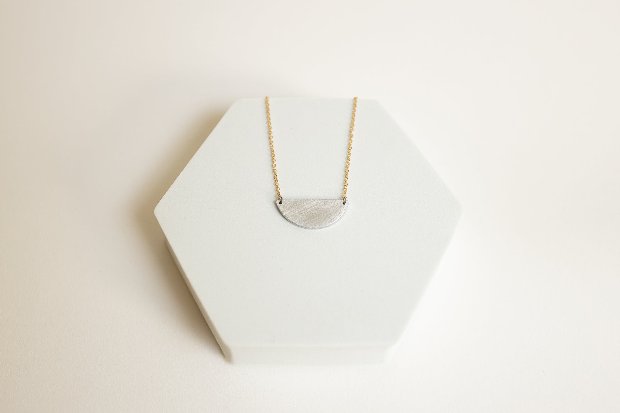 A shield-like aluminum focal point speaks of boldness, while the adjustable gold plated chain shows another, more delicate side. Wear this necklace as a reminder to balance the two in your own life.