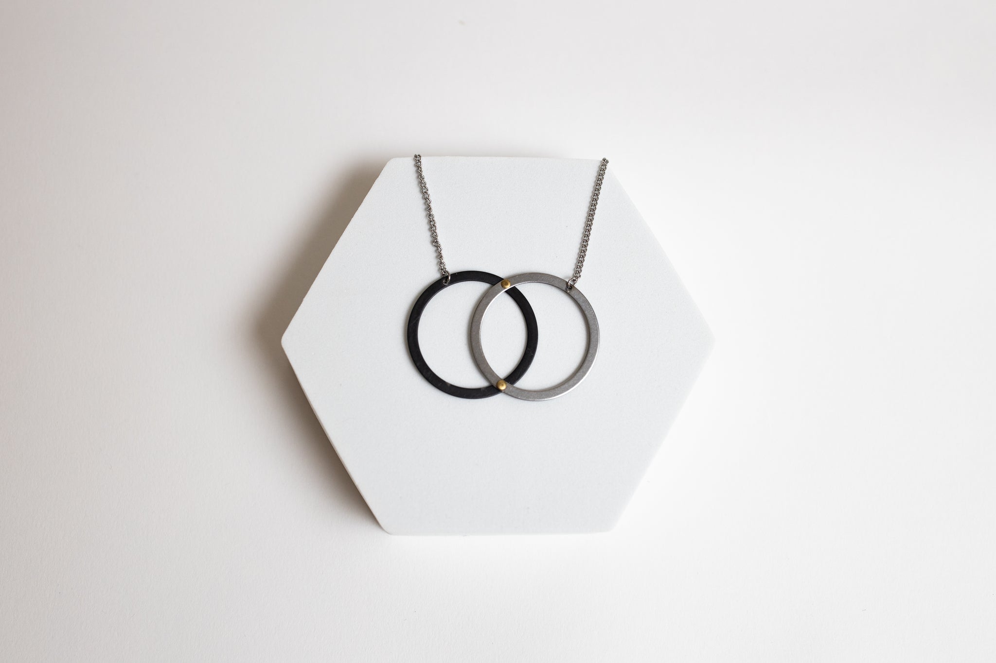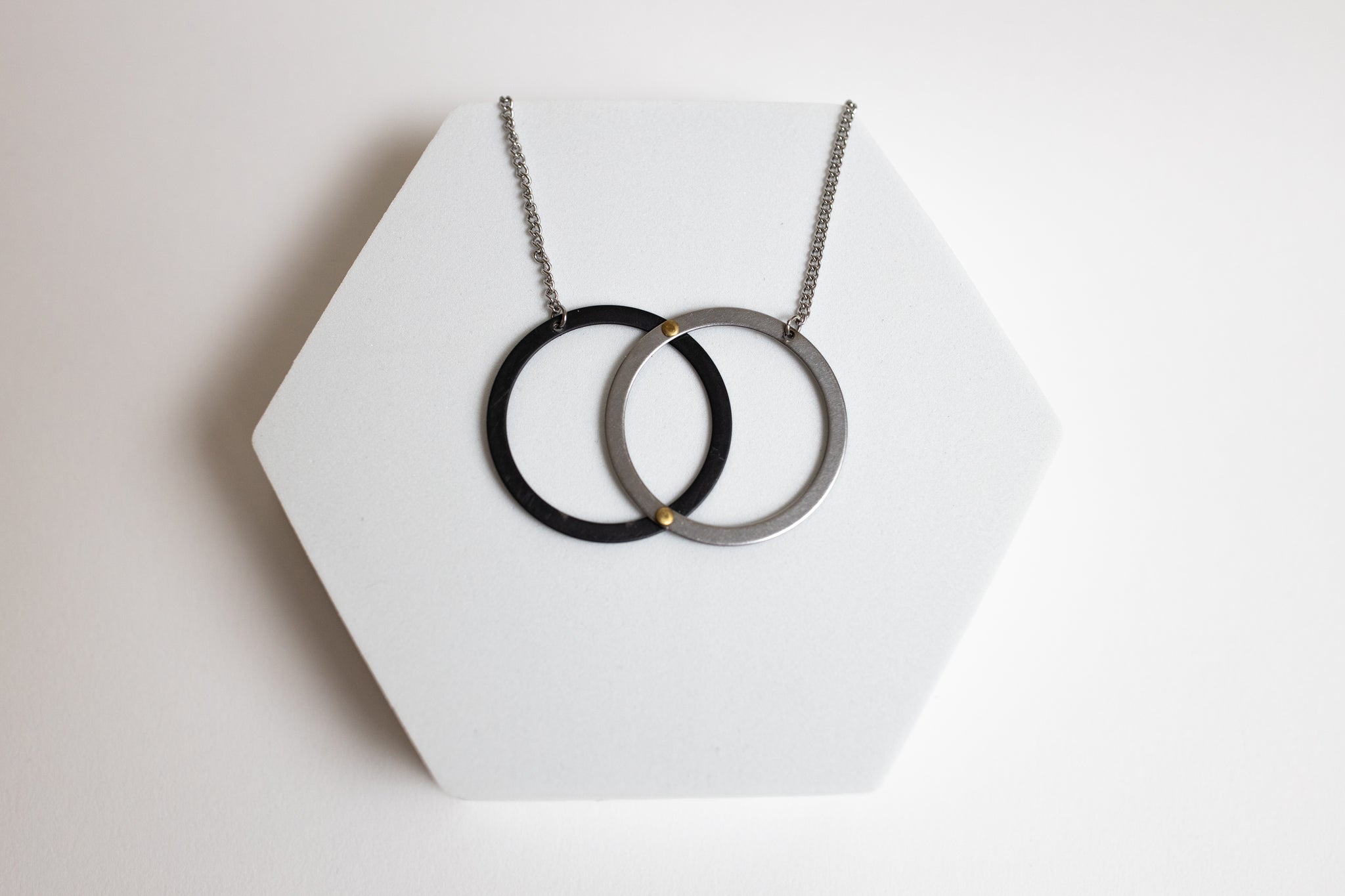 This adjustable stainless steel necklace incorporates contrasting steel shims, held together in a balanced design, perfect for day or night.