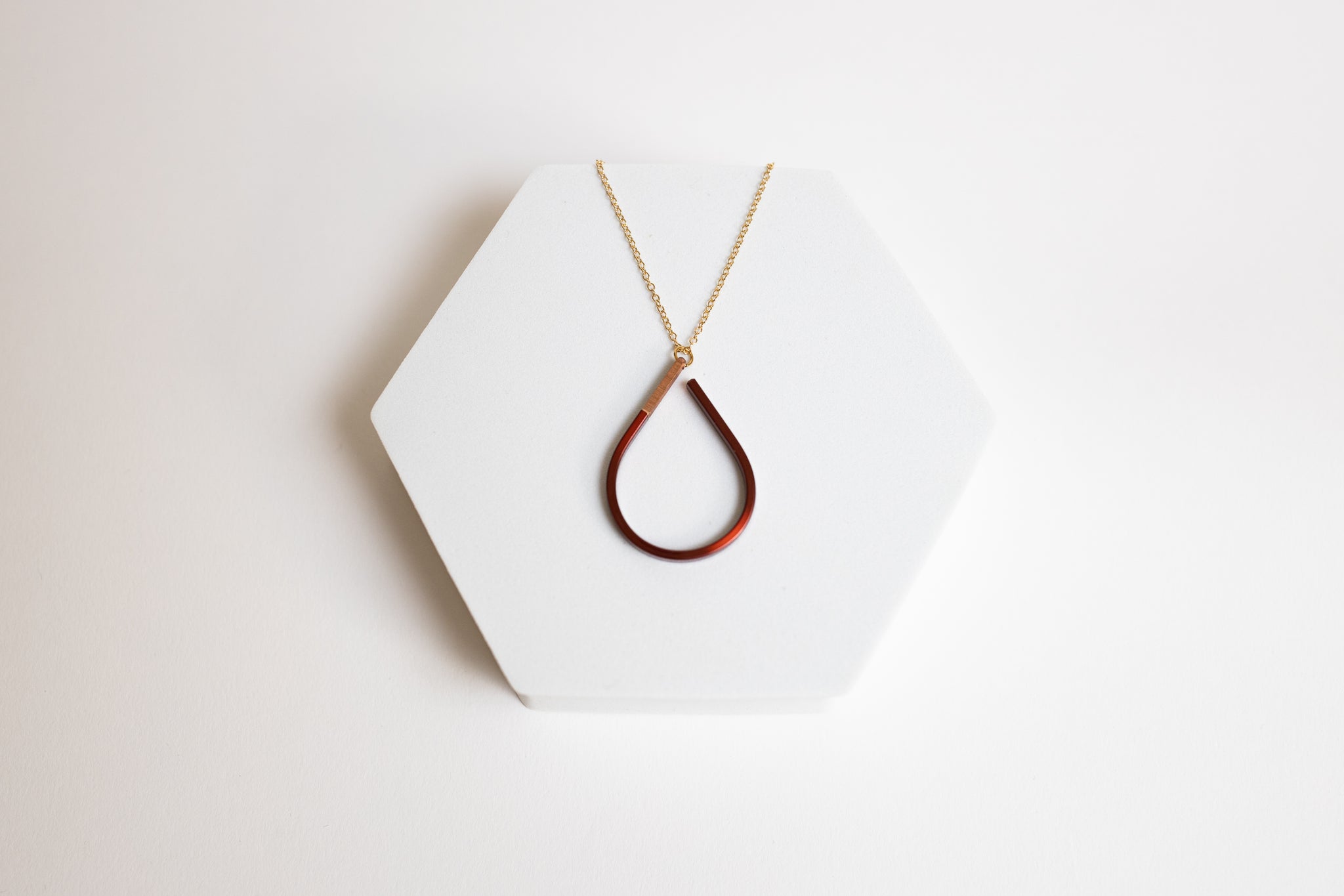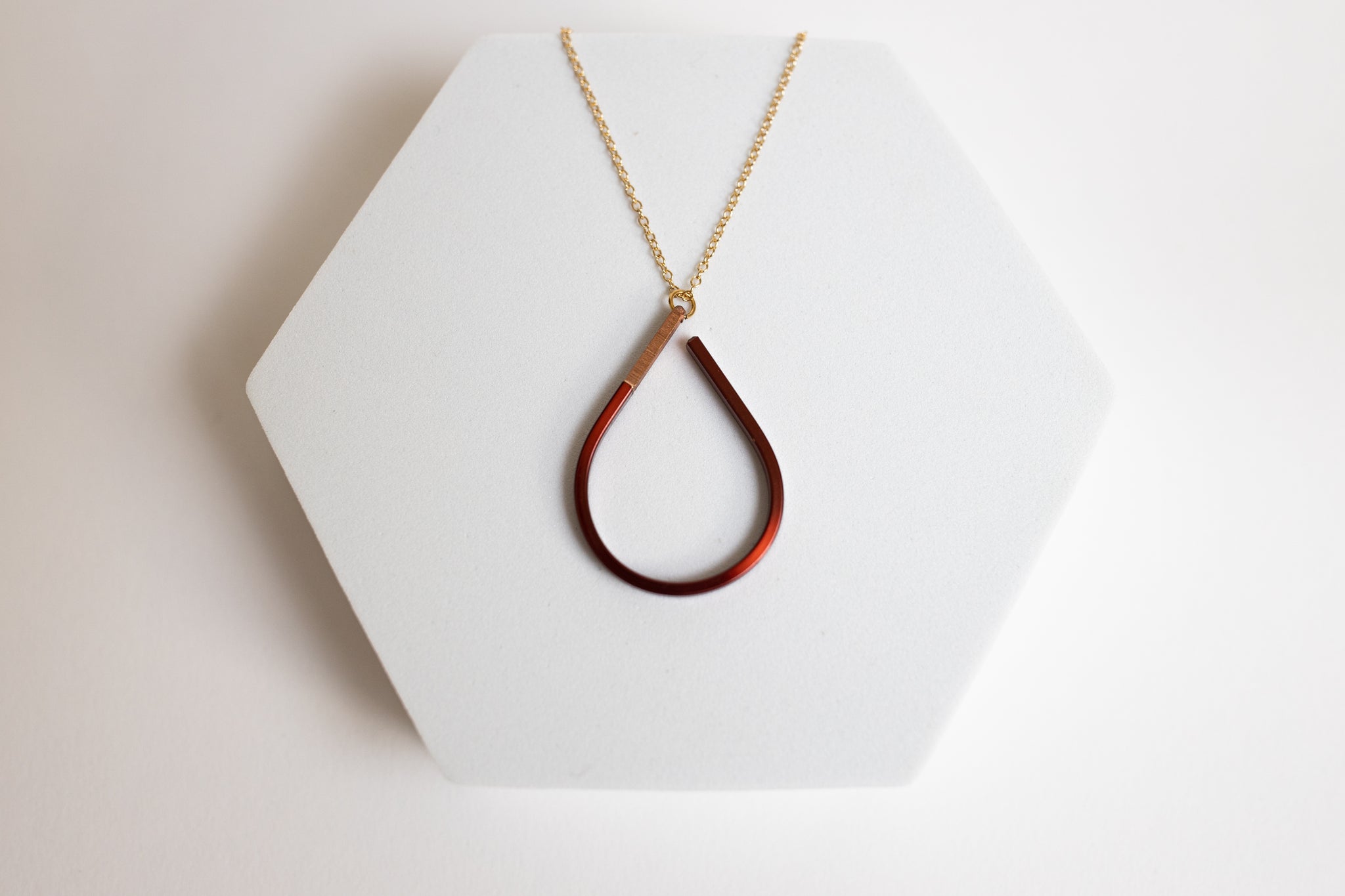This necklace is cut from a copper hairpin that is used in electric vehicle motors. We cut and grind it smooth, showing rich copper and a sleek and shiny wine colored enamel. We then hand shape into a loop pendant that hangs from a delicate gold plated adjustable necklace. Add our matching earrings, available here.