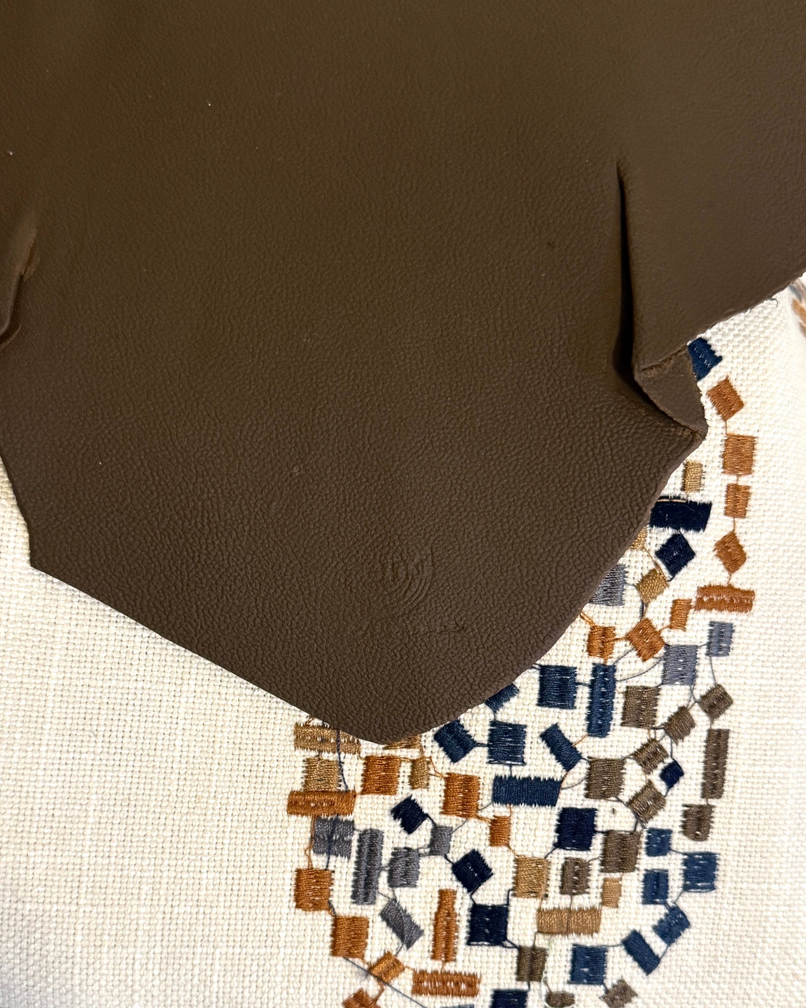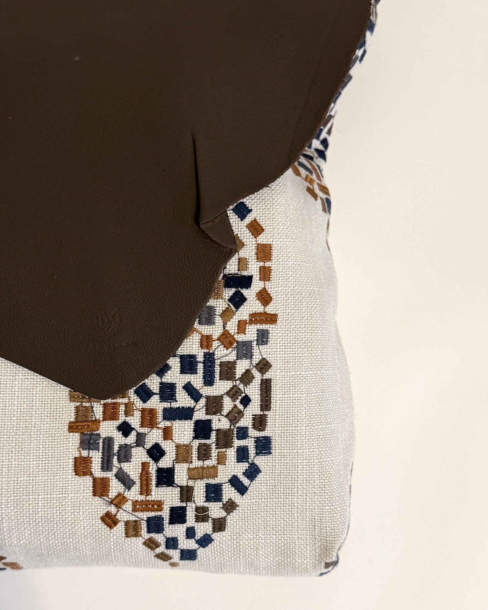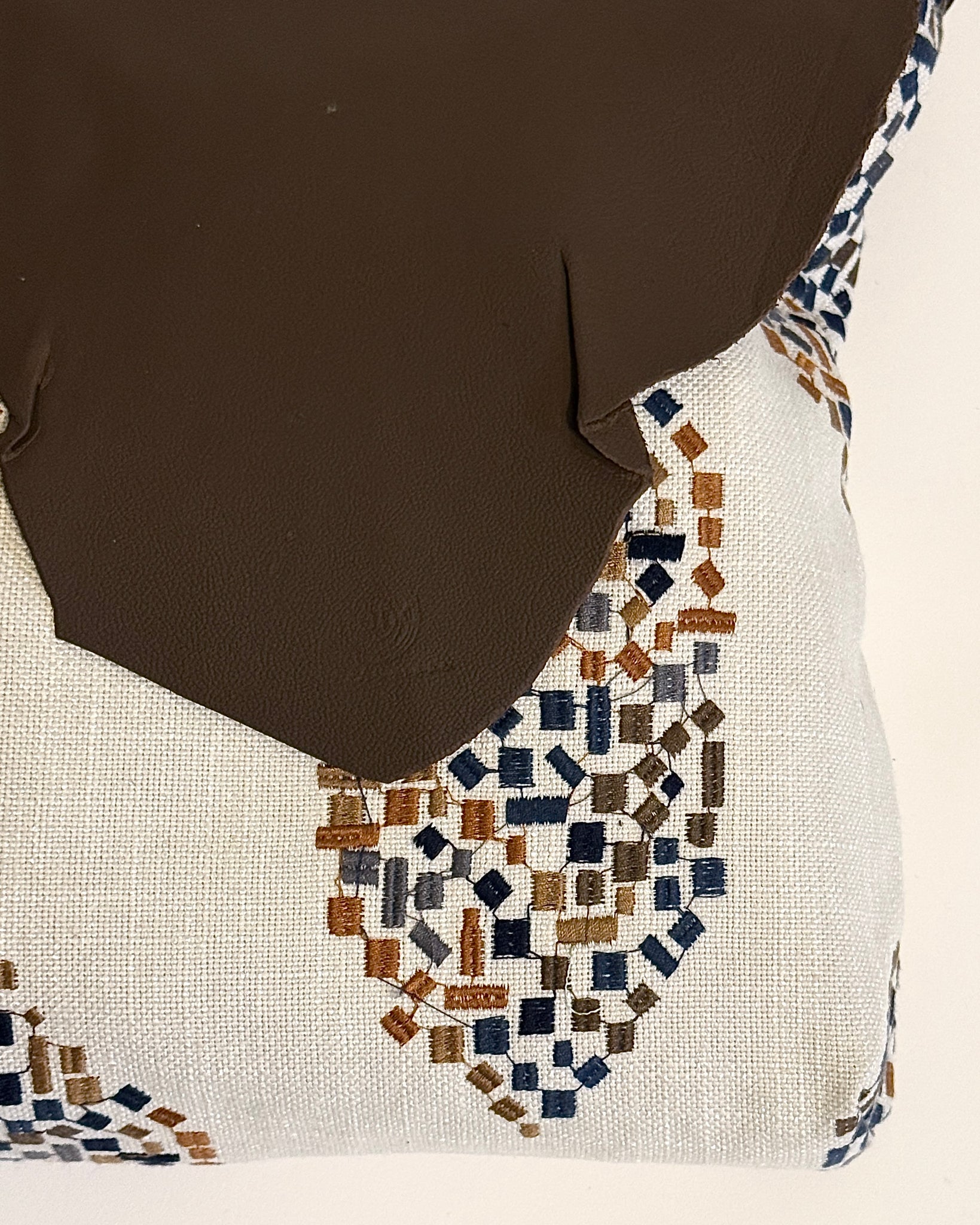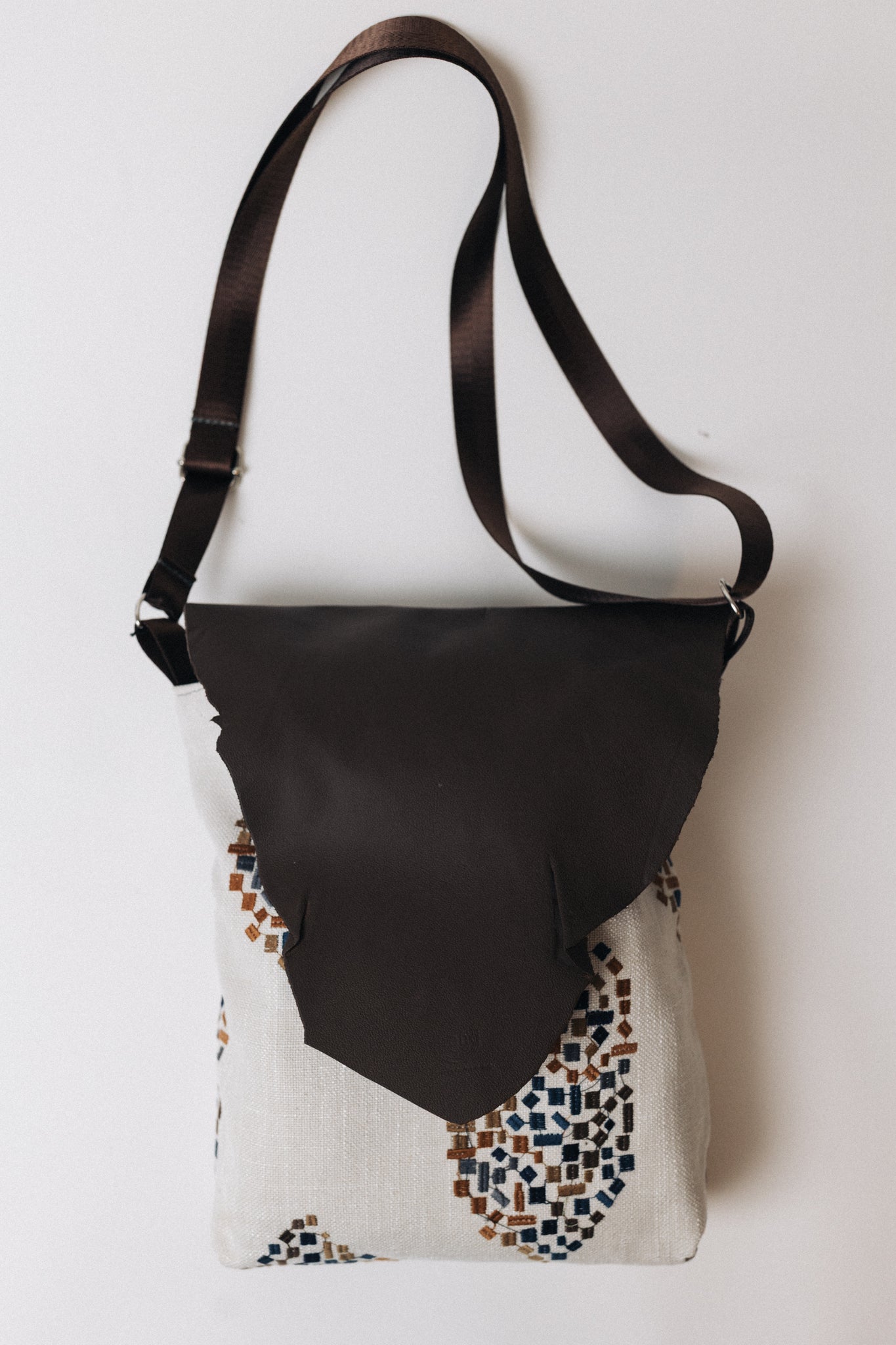 OOAK Upcycled Leather & Fabric Crossbody Purse | Beige, Rust, Navy & Dark Brown Abstract – Mend on the Move